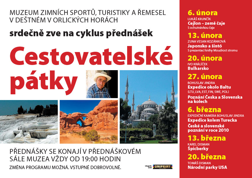 MUZEUM ZIMNÍCH SPORTŮ, TURISTIKY A ŘEMESEL V DEŠTNÉM V ORLICKÝCH HORÁCH srdečně zve na cyklus přednášek Cestovatelské pátky.