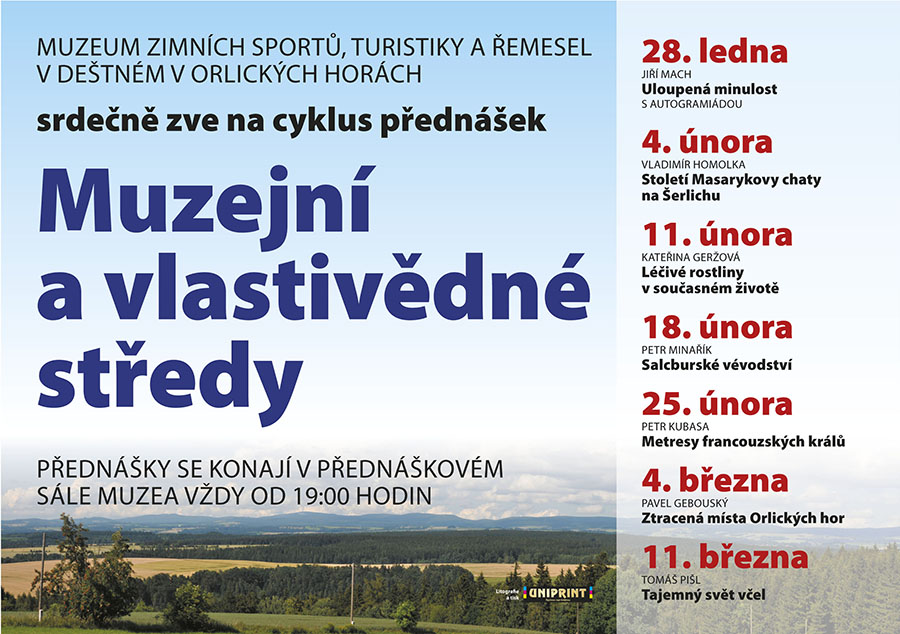 MUZEUM ZIMNÍCH SPORTŮ, TURISTIKY A ŘEMESEL V DEŠTNÉM V ORLICKÝCH HORÁCH srdečně zve na cyklus přednášek Muzejní a vlastivědné středy.